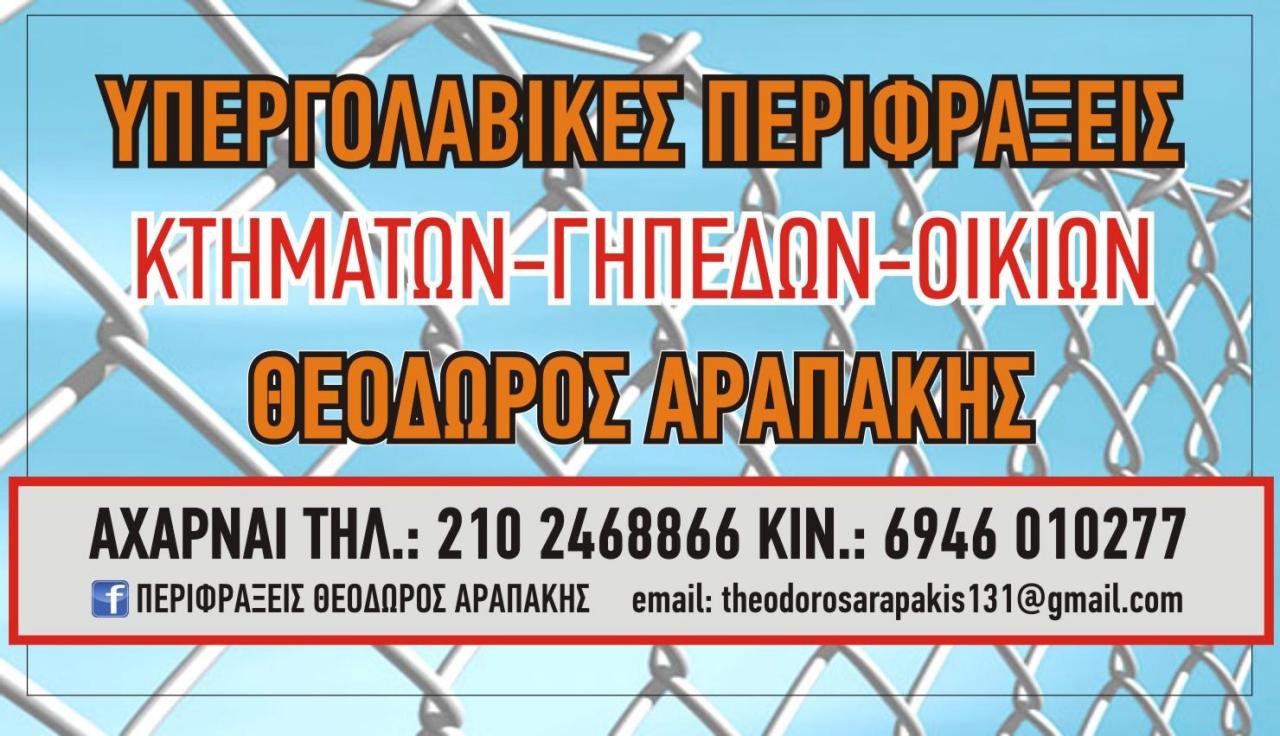 ΠΕΡΙΦΡΑΞΕΙΣ ΣΥΡΜΑΤΟΠΛΈΓΜΑΤΑ ΘΕΟΔΩΡΟΣ ΑΡΑΠΑΚΗΣ ΜΕ ΠΑΝΩ ΑΠΟ40 ΧΡΟΝΙΑ ΠΕΙΡΑΣ ΣΤΟ ΤΟΜΕΑ ΤΟΝ ΠΕΡΙΦΡΑΞΕΩΝ ΠΑΝΤΟΣ ΤΥΠΟΥ ΠΕΡΙΦΡΑΞΕΙΣ.ΟΙΚΟΠΕΔΩΝ, ΣΤΡΑΤΟΠΑΙΔΩΝ, ΑΕΡΟΔΡΟΜΙΟΝ, ΓΗΠΕΔΟΝ ΣΕ ΟΛΗ ΤΗΝ ΕΛΛΑΔΑ.ΑΝΑΛΑΜΒΑΝΟΥΜΕ ΠΕΡΙΦΡΑΞΕΙΣ ΚΑΙ ΜΕ ΔΙΚΑ ΣΑΣ ΥΛΙΚΑ .ΜΕ ΥΠΕΥΘΥΝΟΤΙΤΑ ΚΑΙ ΑΞΙΟΠΙΣΤΙΑ